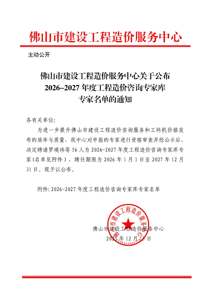 轉發 | 佛山市建設工程造價服務中心關于公布2026-2027年度工程造價咨詢專家庫專家名單的通知