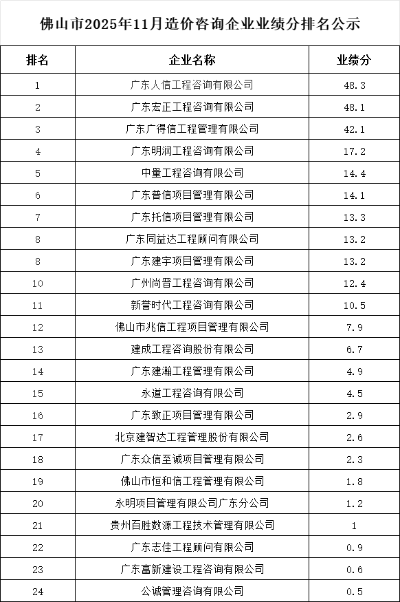 轉(zhuǎn)發(fā) | 佛山市2025年11月造價咨詢企業(yè)業(yè)績分排名公示