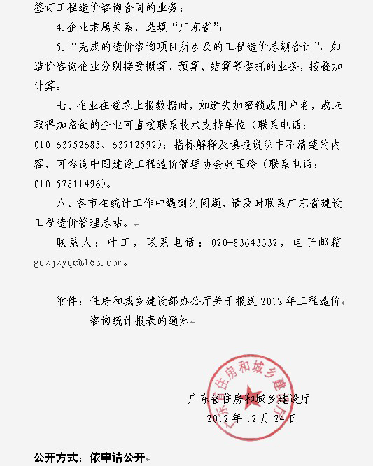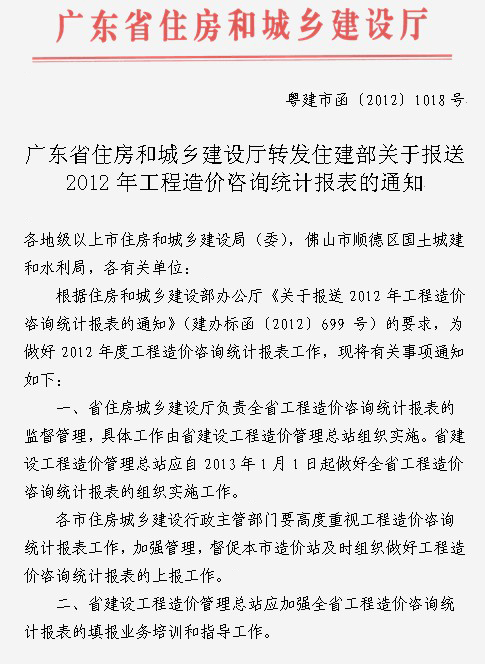 廣東省住房和城鄉建設廳轉發住建部關于報送2012年工程造價咨詢統計報表的通知