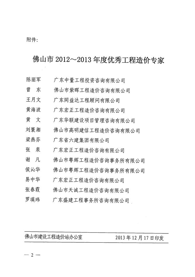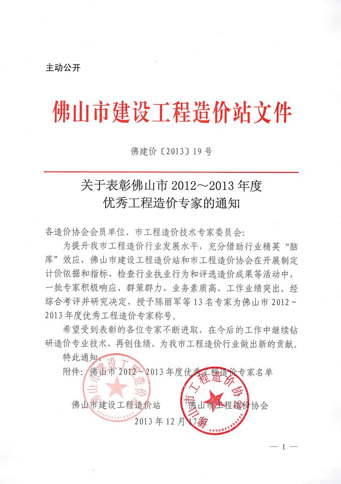 關于表彰佛山市2012~2013年度優秀工程造價專家的通知