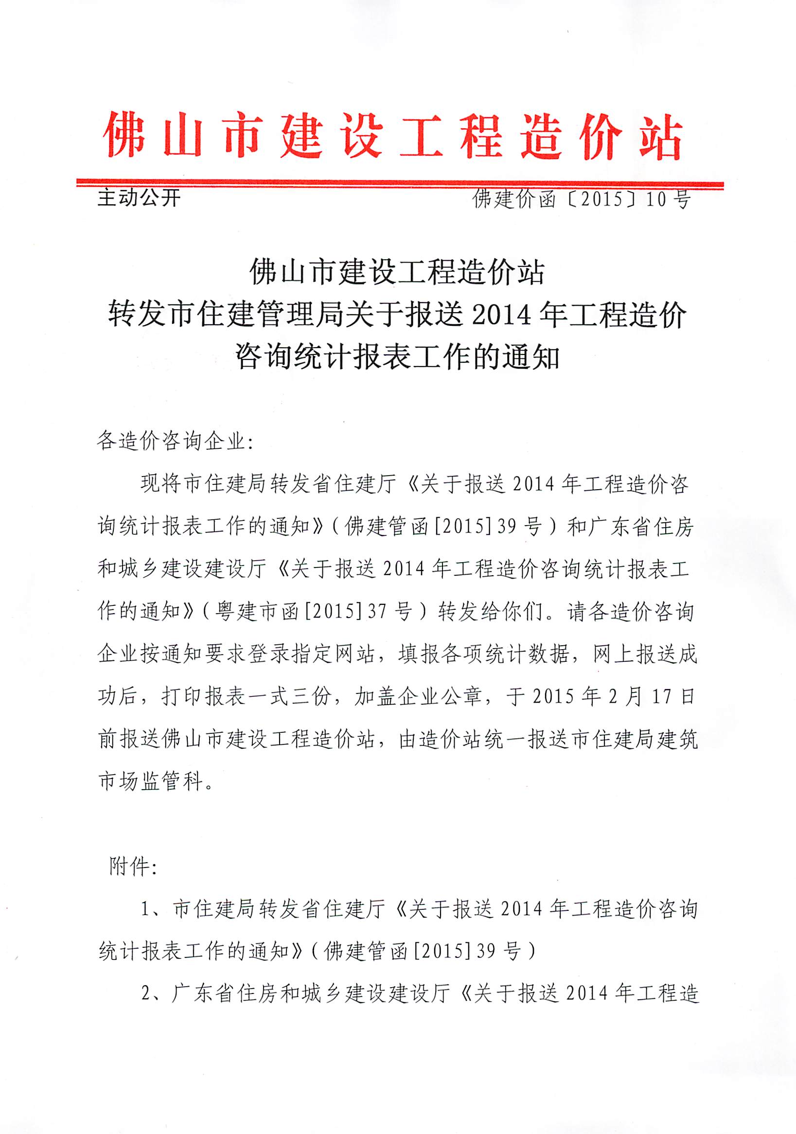 佛山市建設工程造價站轉發市住建管理局關于報送2014年工程造價咨詢統計報表工作的通知