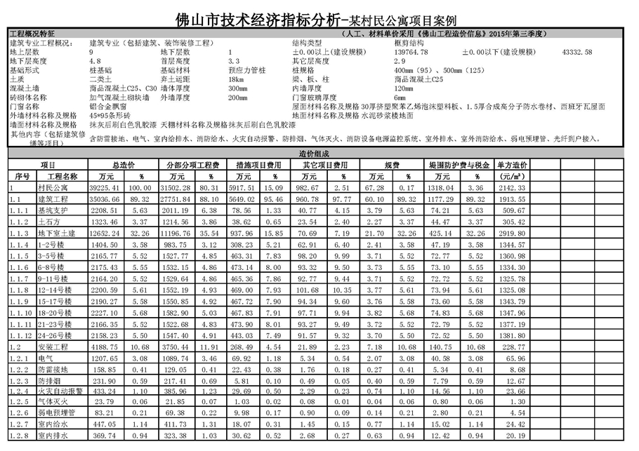 佛山市2015年第4季度技術經濟指標分析—某村民公寓項目案例