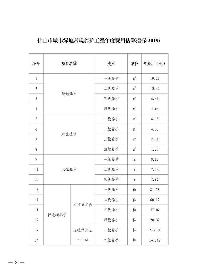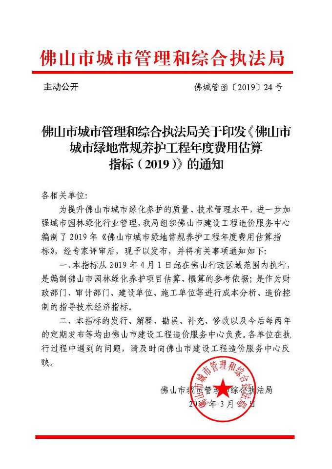 佛山市城市管理和綜合執法局關于印發《佛山市城市綠地常規養護工程年度費用估算指標(2019)》的通知