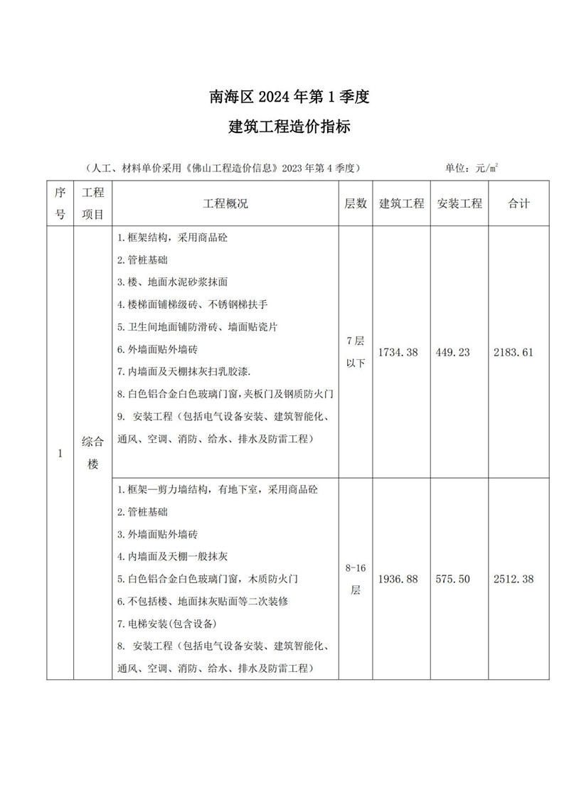 南海區(qū)2024年第1季度建筑工程造價(jià)指標(biāo)