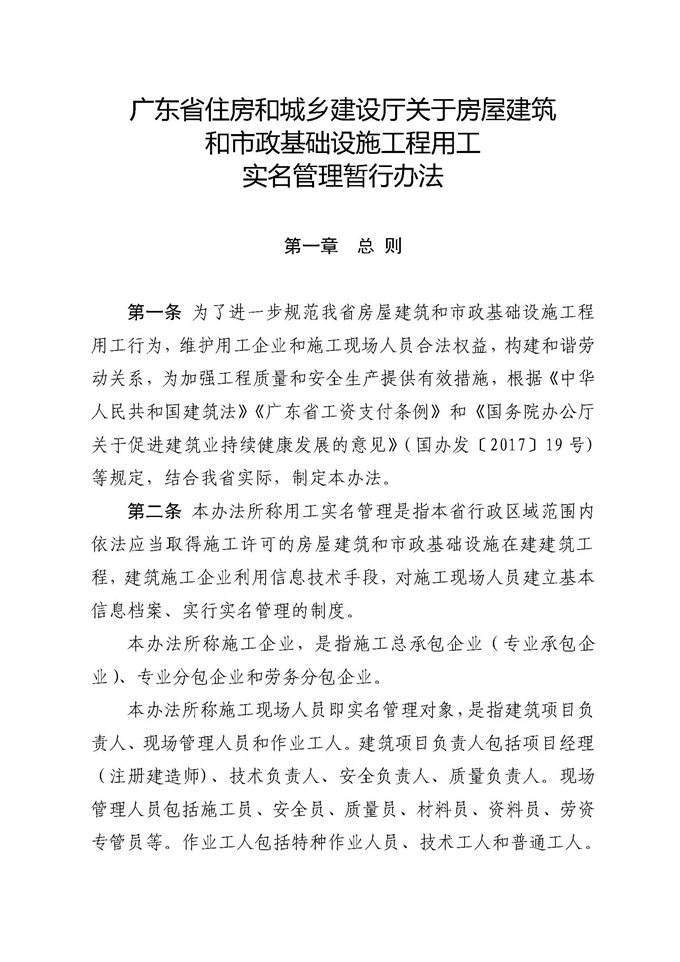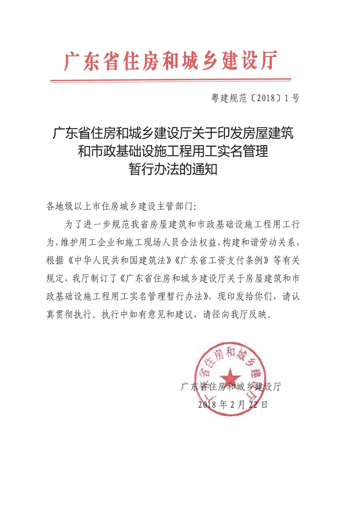 廣東省住房和城鄉建設廳關于印發房屋建筑和市政基礎設施工程用工實名管理暫行辦法的通知