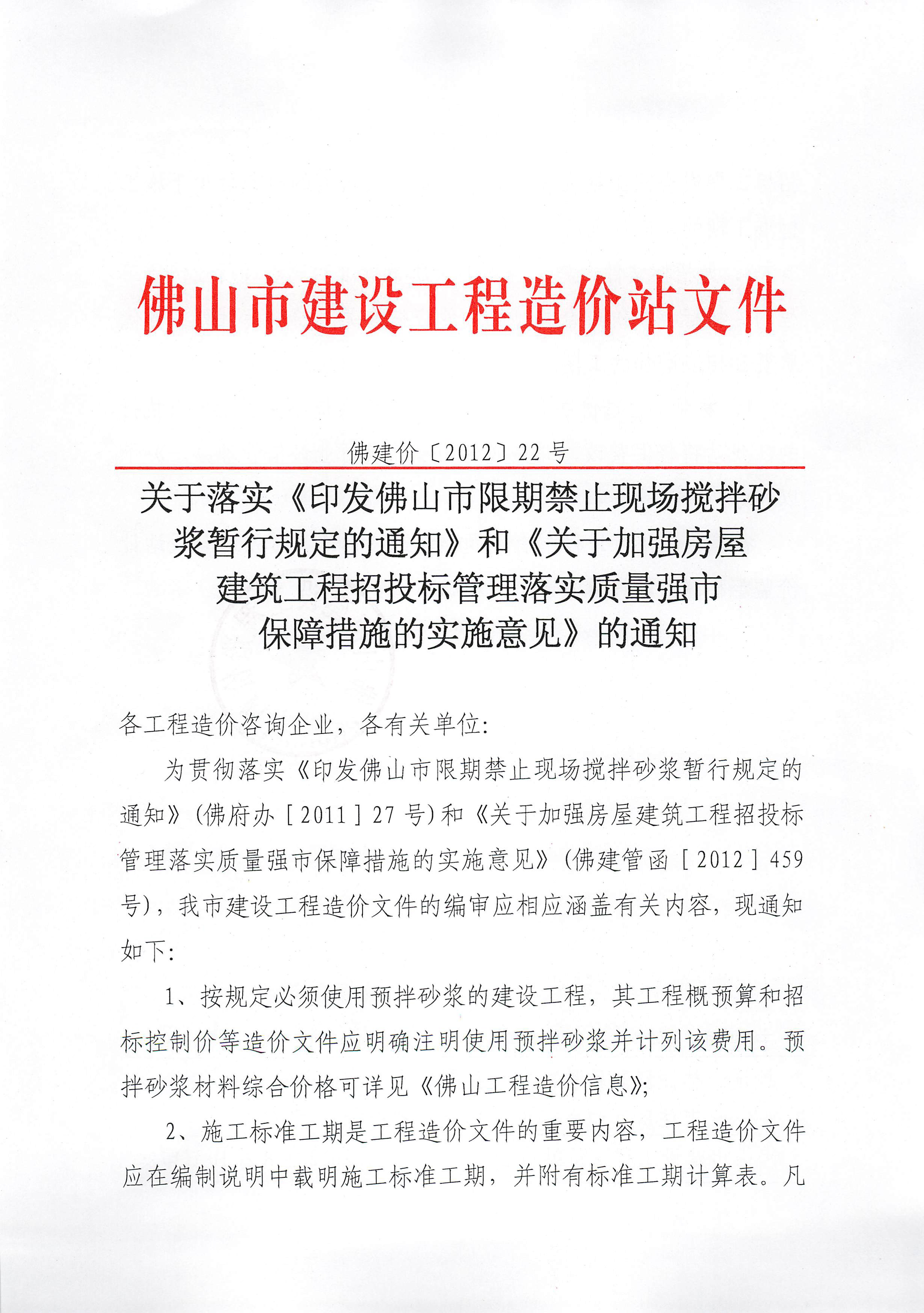 關于落實《印發佛山市限期禁止現場攪拌砂漿暫行規定的通知》和《關于加強房屋建筑工程招投標管理落實質量強市保障措施的實施意見》的通知